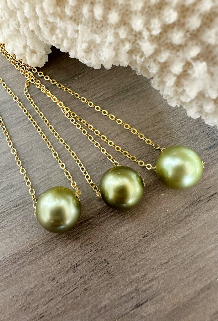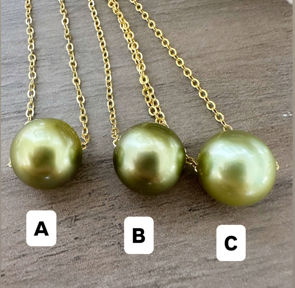When we say big, we mean big!! The Pistachio Tahitian Pearl actually comes in a variety of shades, and these 3 are a collector's dream! Large, round, flawless, Grade AAAA HUGE 14.5-155m stunners! Tahitian Pearls of this size take over 10 years to grow! Each Tahitian Pearl floats along a slightly longer (18-20") 14kgf chain with min puka shell on the end. Wear these bombucha-sizes Tahitians alone or layer with others. Each Pearl photographed is a one-of-a-kind and is the exact one you will receive!