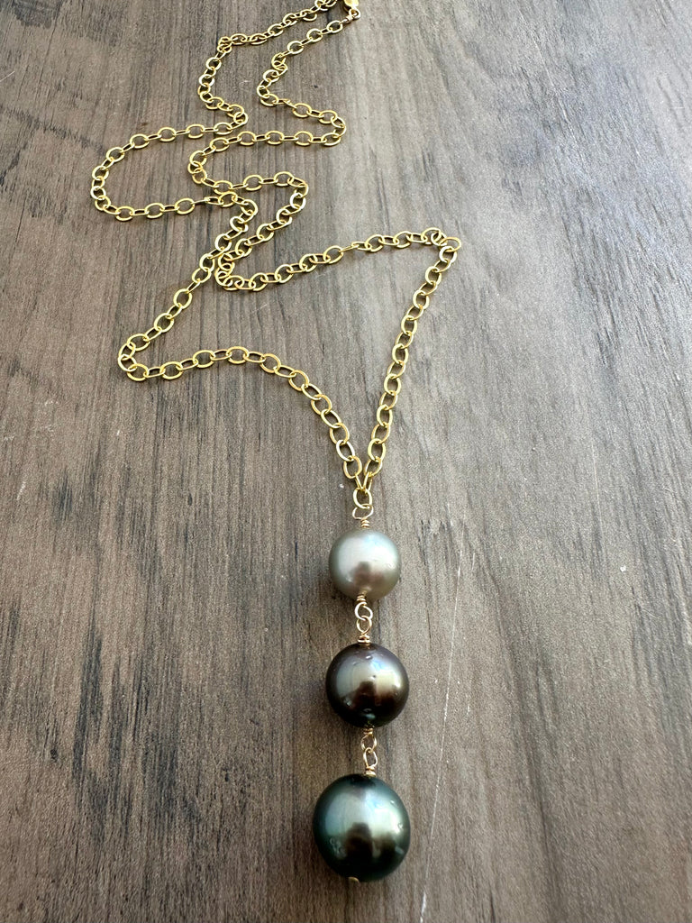 This one-of-a-kind long necklace feature a gorgeous ombre trio of Tahitian Pearls cascading from a 14kgf adjustable 26" chain. This Grade AAAA Trio features a gorgeous 12.2mm light silvery Tahitian Pearl, a 13mm Deep Tahitian Pearl with Mauve undertones and a 14mm deep Blue Tahitian Pearl. The necklace photographed is the exact one you will receive, there's only one...and it won't disappoint!