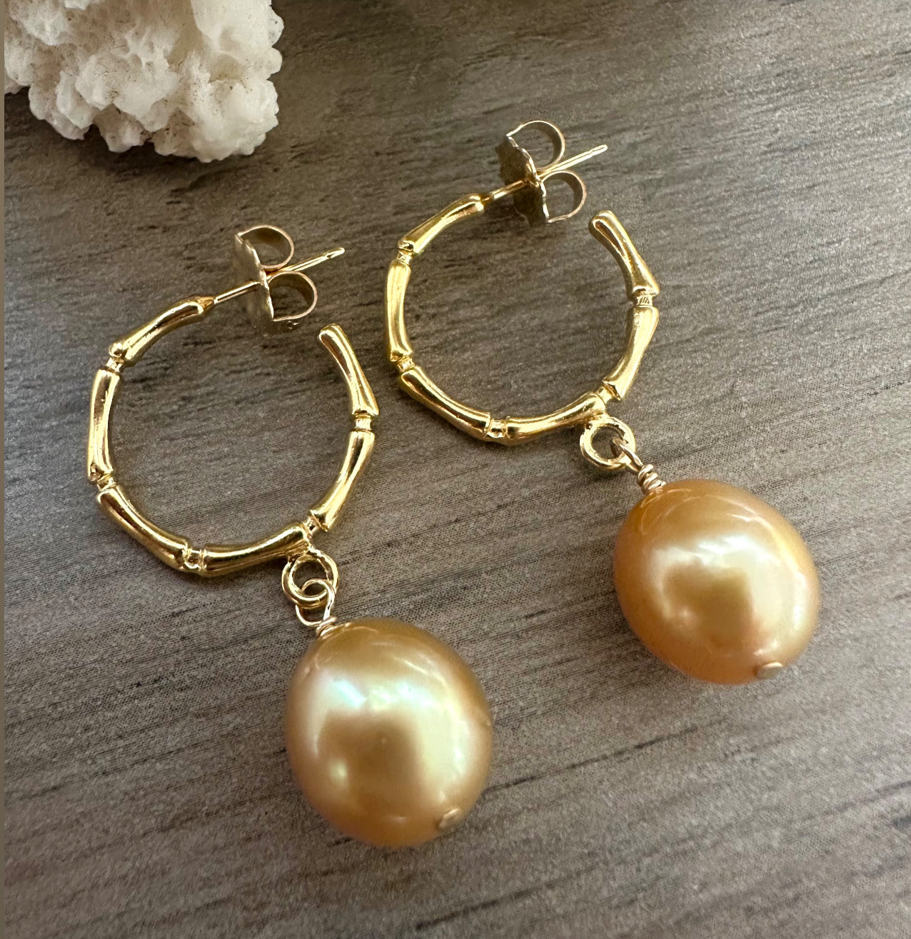Earring B features our original Bamboo Carved hoops, cast in solid sterling silver and dipped in 14k gold! 14kgf posts and backings, these 0.75" bamboo hoops represent long life and good luck. The perfectly matched oval 11.4 x 12.2mm Golden South Sea Pearls are 100% natural, not color enhance in any way! Natural Golden Honey hue to this pair of Golden South Sea Pearls!