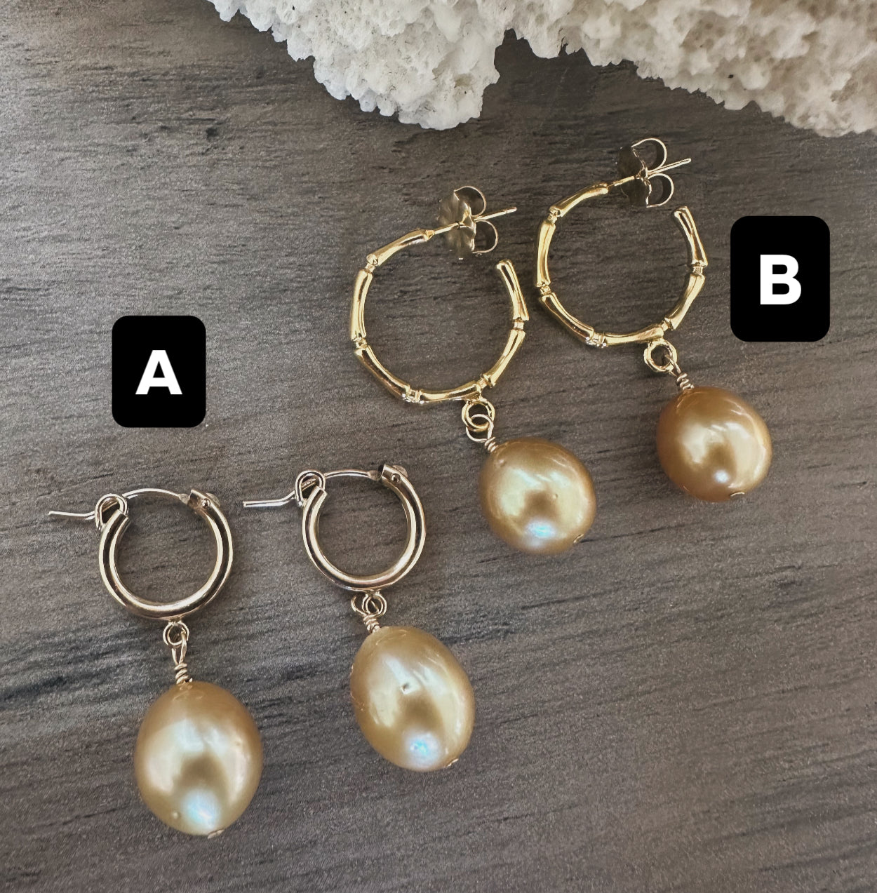 Earriing A: Our popular 0.5" 14kgf huggie hoops are light, durable and so easy to wear! No backings needed, these hoops sit close to your ear and highlight the pair of fabulous Grade AAAA oval natural Golden South Sea Pearls (11.4 x 12.2mm Golden South Sea Pearls, 100% natural). Natural Golden Honey hue to this pair of Golden South Sea Pearls!