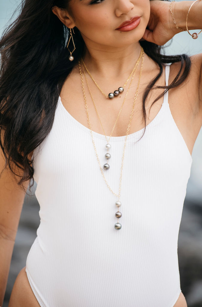 If you haven't seen a sunset at Hanalei Bay on the Island of Kaua'i, definitely put it on your bucket list! This one-of-a-kind long necklace is designed after the ombre of colors that linger in your memory after you experience a sunset in Hanalei. All three Tahitian Pearls are Grade AAAA and feature: a gorgeous 12mm light silvery Tahitian Pearl, a 12.2mm grey-blue Tahitian Pearl and a 12.5mm deep Tahitian Pearl cascade from an adjustable 14kgf cable chain (adjustable up to 24" + the 2" trio of pearls). The necklace photographed is the exact one you will receive, there's only one...and it won't disappoint!