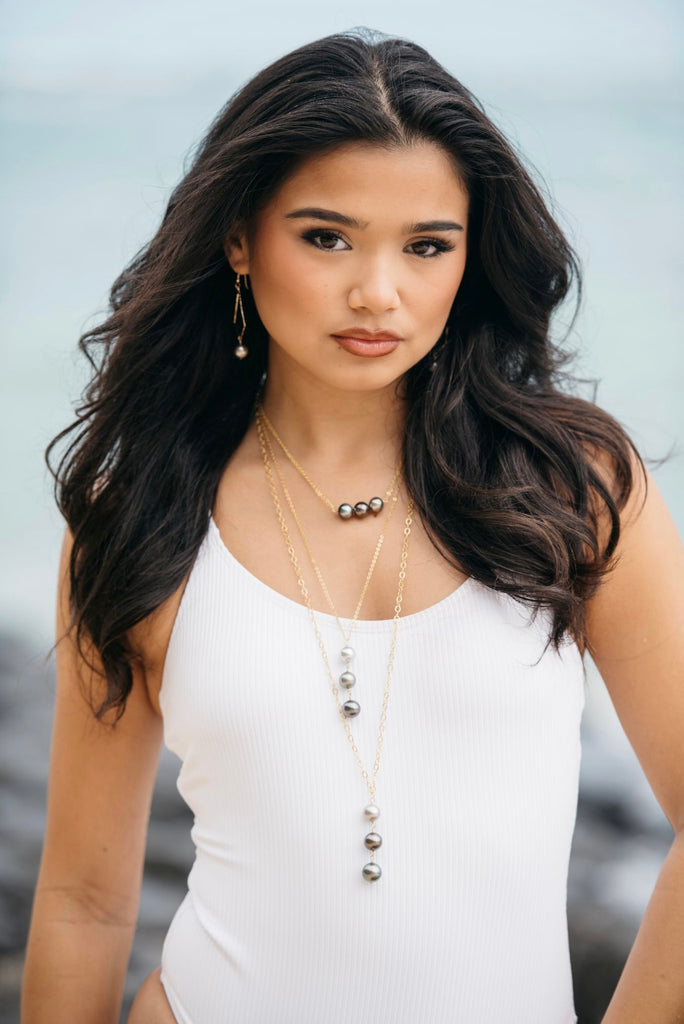 3 Grade AAA naturally iridescent Tahitian Pearls in rare colors: a 11.2mm Iridescent Ocean Blue Tahitian, a 11.5mm Iridescent Plum Tahitian and a 11.2mm Iridescent Ocean Kelp Tahitian Pearl. This trio is a one-of-a-kind piece to treasure, and has all the Tidepool Love signature details like double wrapped 14kgf chains, 2" extender and mini puka shell on the end. The necklace photographed is the exact one you will receive! 17-19" in length