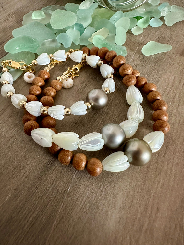 Gorgeous mini Mother-of-Pearl Pikake blossoms dance around your wrist. The large 11.5mm Tahitian Pearl is natural (not color enhanced or dyed ever!!) and this Grade AAA beauty is perfectly round and the luster is stunning! The bracelet photographed is an Adult size S (adjustable 6-7") with a tiny puka shell on the end .