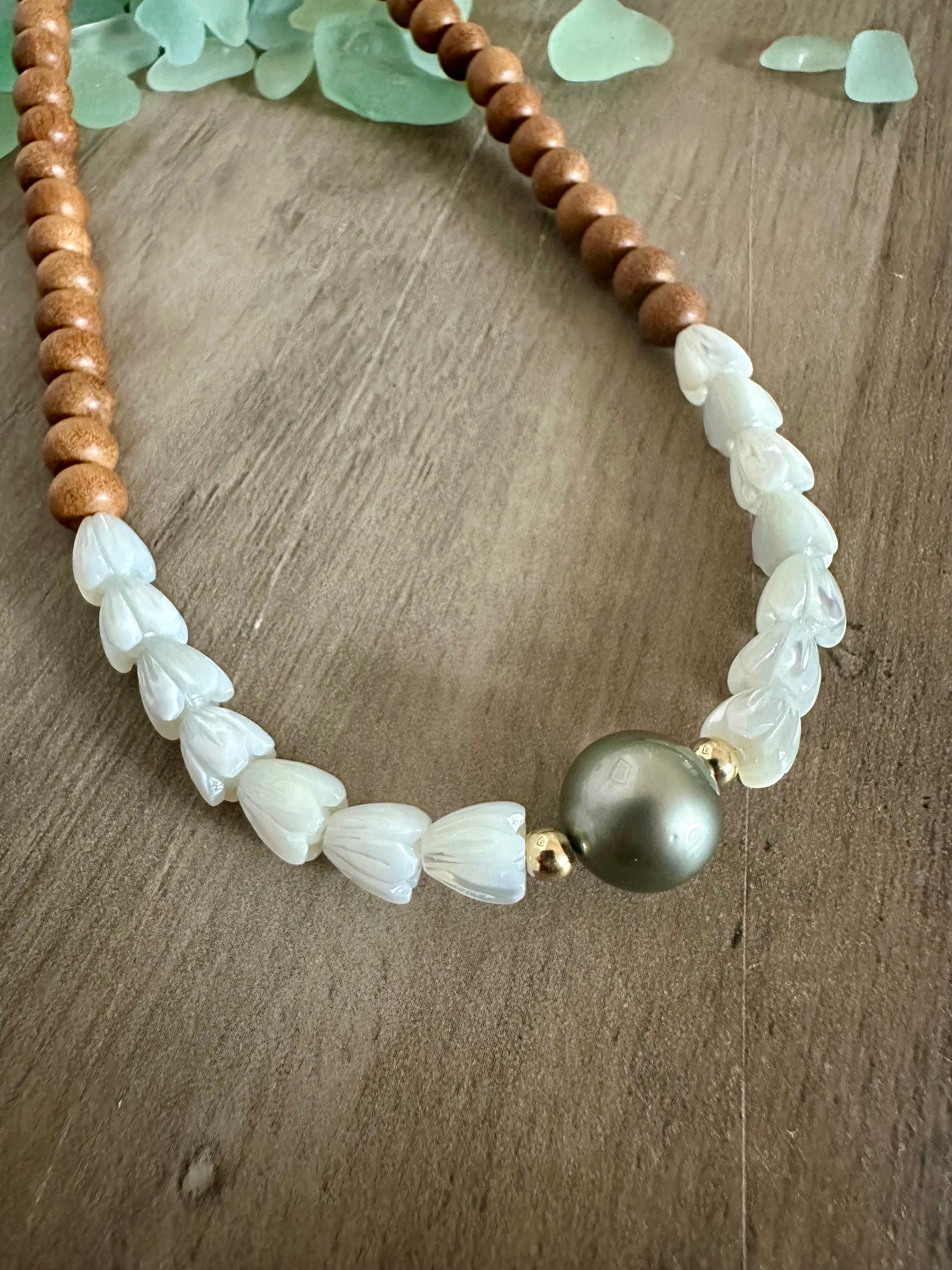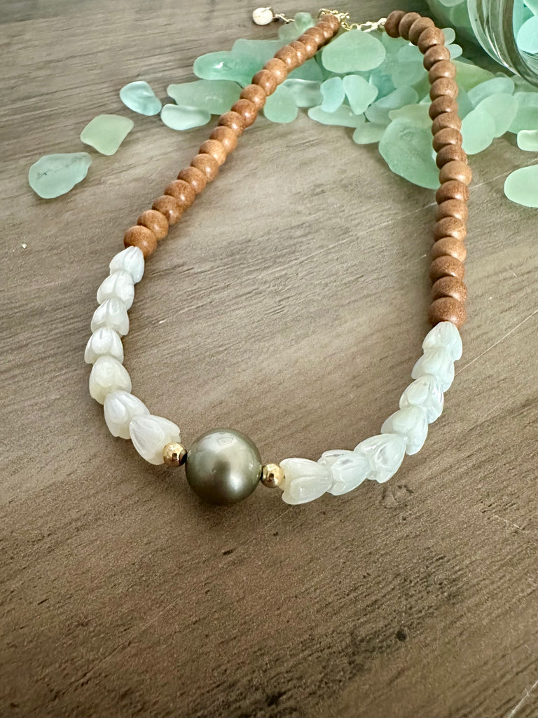 A flawless, Grade AAAA Tahitian Pearl + pretty little carved Pikake blossoms + fragrant Sandalwood = a perfect one-of-a-kind piece to treasure! Wear alone or layer with others, this necklace has all the feels. The 12mm Tahitian Pearl is Grade AAAA and flawless. The pikake are NOT plastic or composite, but are carved from Mother-of-Pearl. 24-26" long.