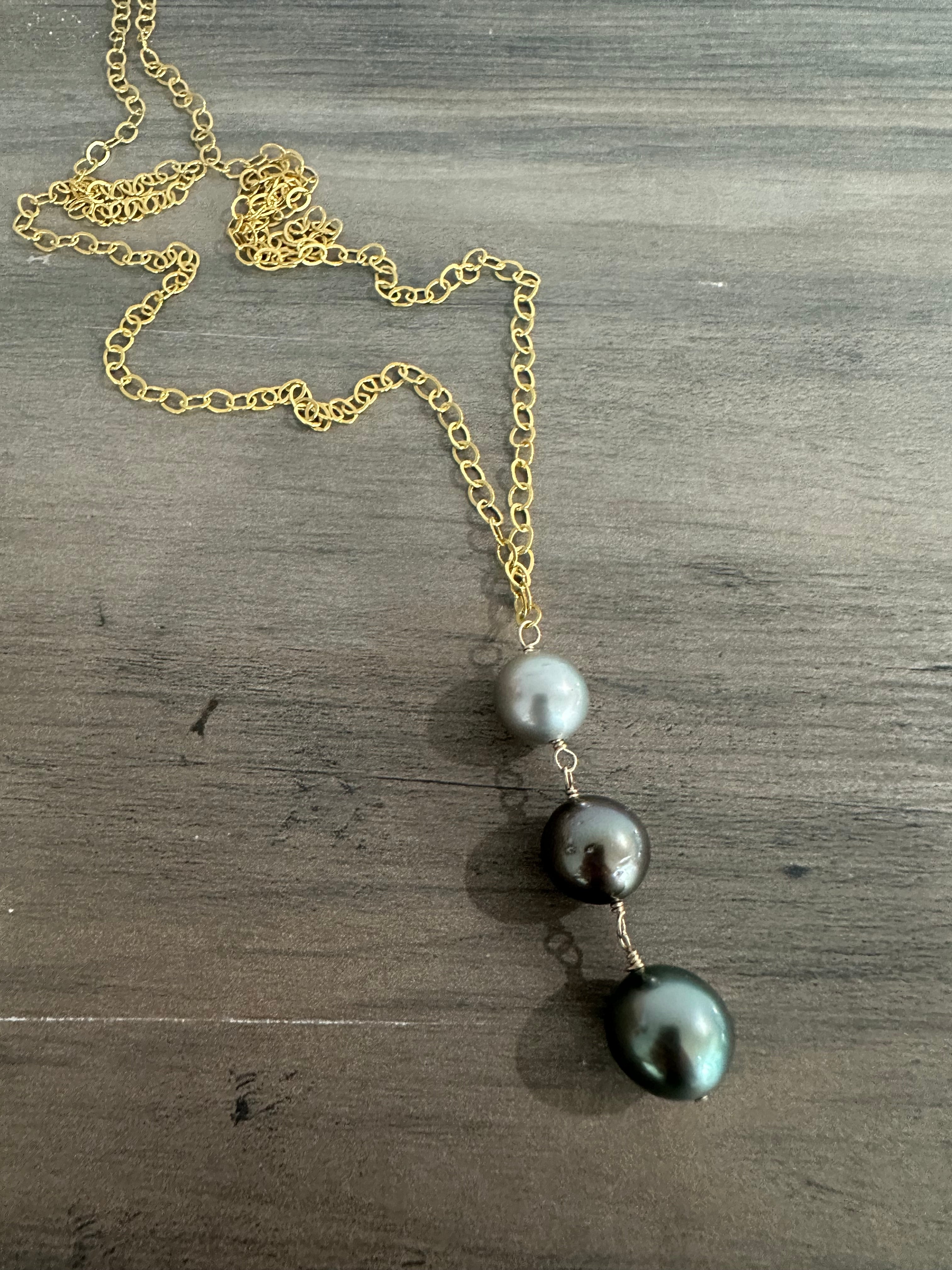 Three Grade AAAA Tahitian Pearls perfectly graduated in size (12.2mm, 13mm and 14mm) and in natural hues of Silver grey, Plum and Iridescent Midnight Blue. The òmbre of three cascade from a 14kgf cable chain that is fully adjustable up to 32". This one-of-a-kind necklace can be worn alone or layered with other favorites!