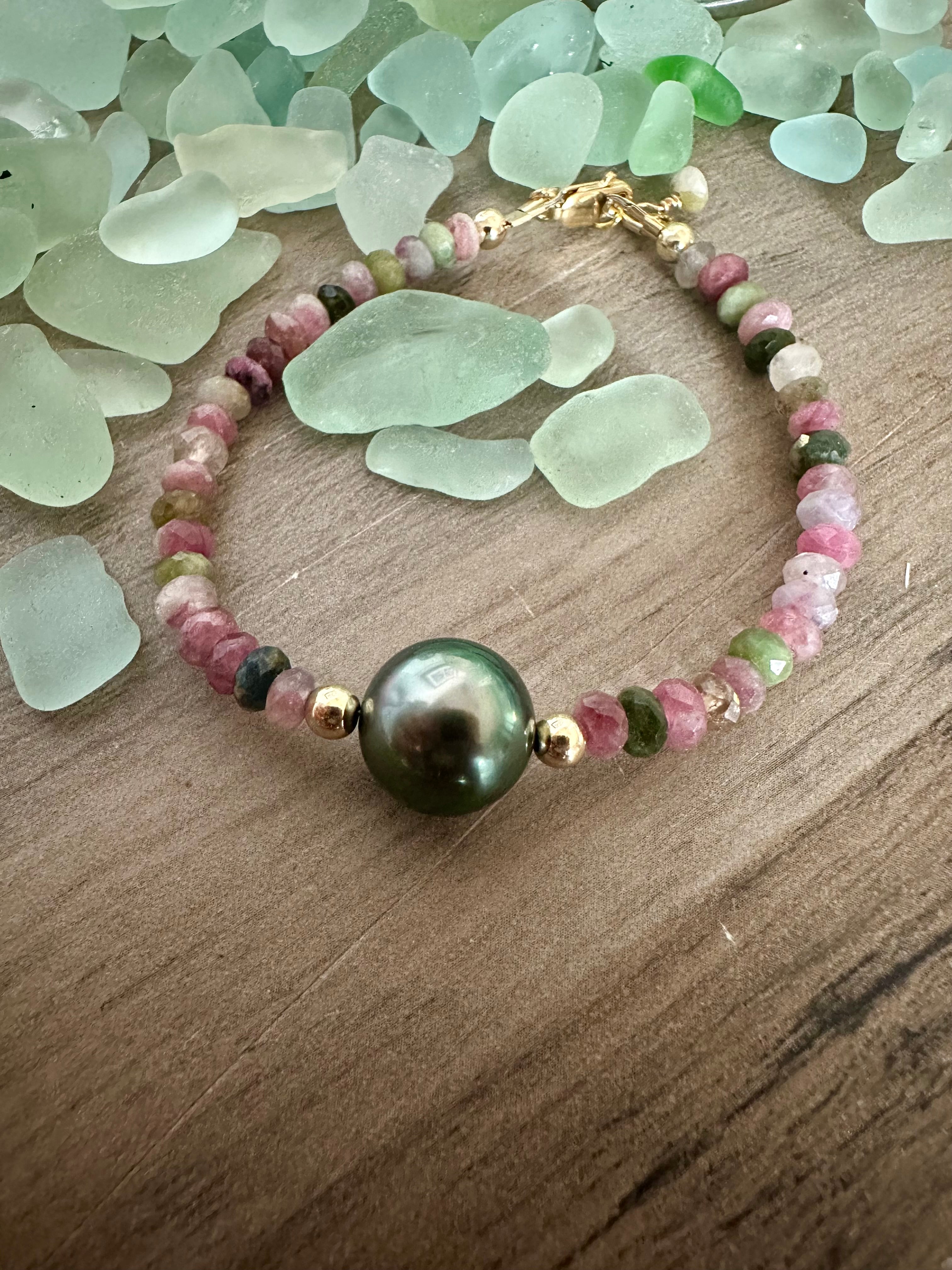 Natural Watermelon Tourmaline stones in a variety of pretty hues, this bracelet is a fun piece you will want to wear as much as possible! Watermelon tourmaline is one of the most requested stones we use, and these pretty stones show exactly why they are so popular! Light greens, pinks, mauves, browns and even shades of light yellow...watermelon tourmaline is associated with love, compassion and emotional healing. The Tahitian Pearl featured front and center is large (12.5mm) and Grade AAA.