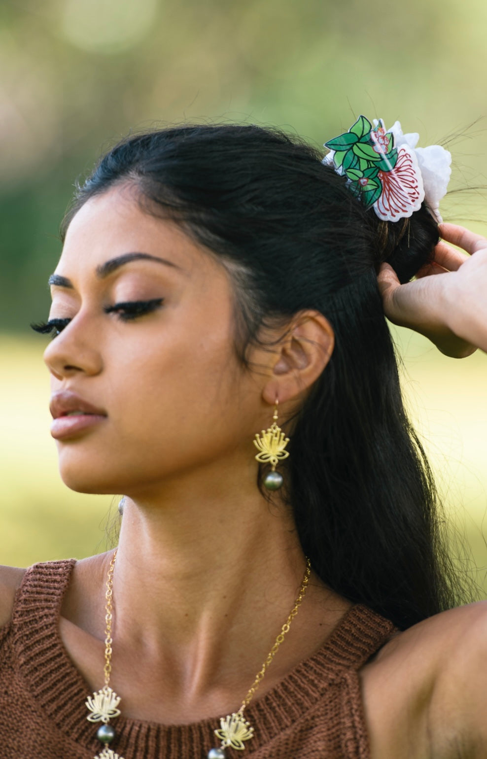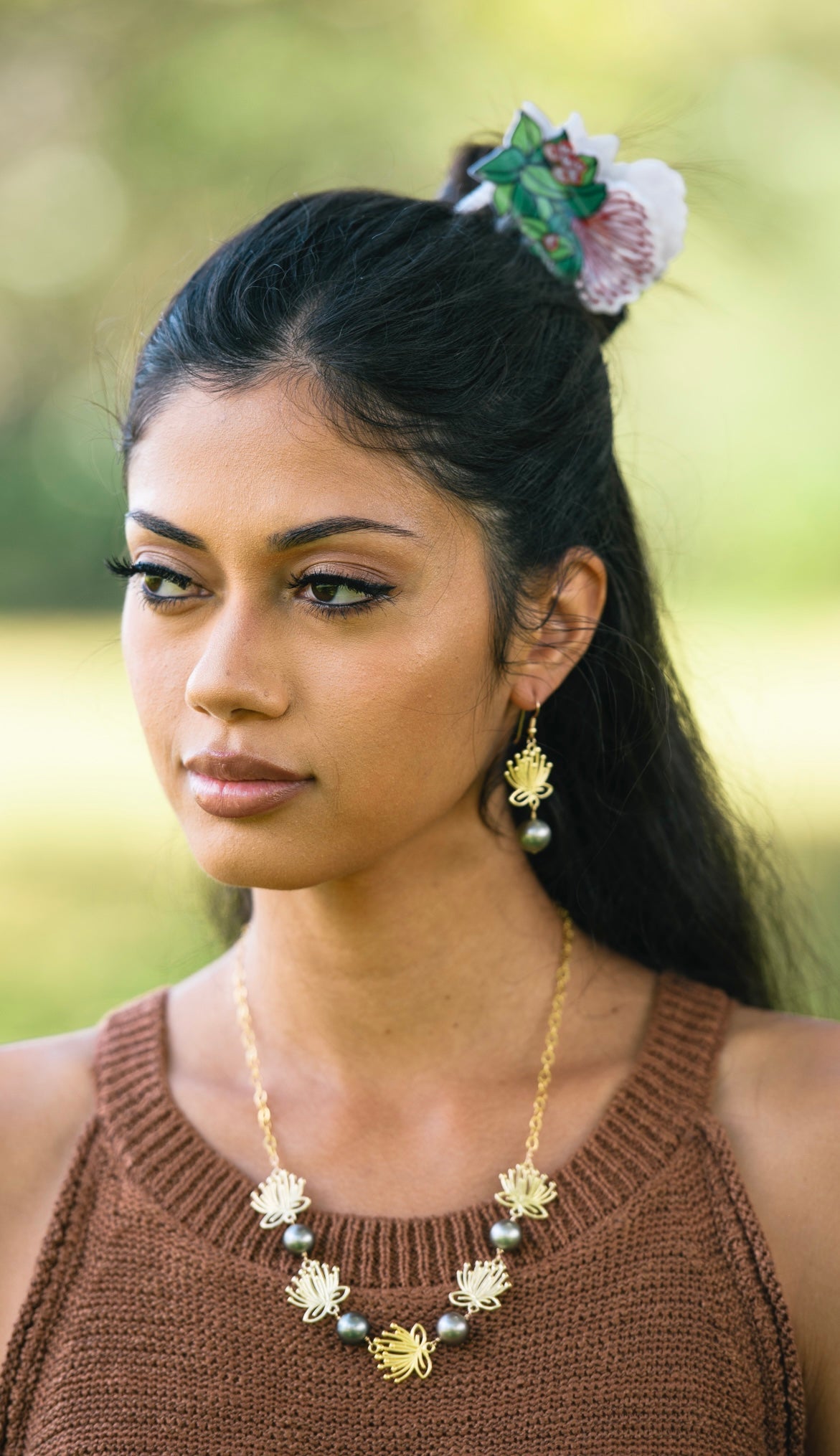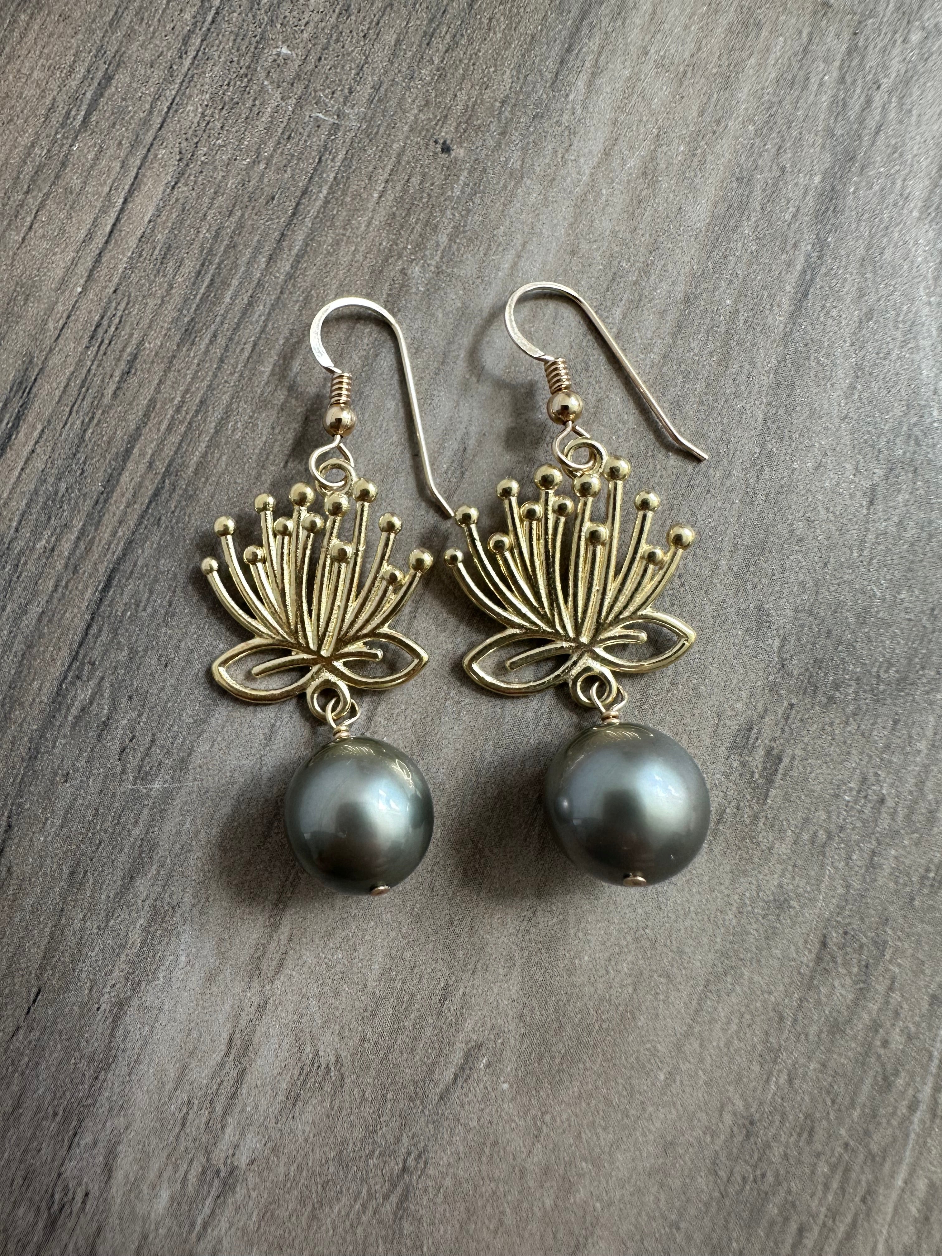 Our original 'ōhi'a lehua blossoms are carved and cast in sterling silver then heavily dipped in 14k gold. These won't tarnish or turn color and will be your favorite earrings to wear day and night!! This one-of-a-kind earring features perfect Grade AAAA 11.5mm large Tahitian Pearls. Total length of this earring is 2" (including the 14kgf earring hooks and the Grade AAAA Tahitian Pearls).